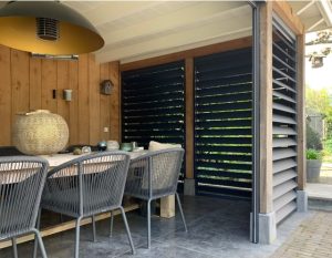 Incorporar pérgolas o toldos en un cerramiento de porche añade opciones de sombra y protección adicional frente al sol.